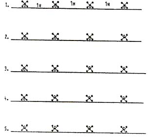 Когда лошадь приобрела опыт при напрыгивании на свободе, она будет и под всадником прыгать так же хорошо. Особенно, если всадник сидит плотно и не мешает лошади, она быстро уравновесится под ним на прыжках. Чтобы дать лошади время на уравновешивание, нужно в начале подготовки работать на кавалетти на шагу и рыси на облегченной посадке. Сначала кавалетти кладутся жердью на землю, 4 шт. в ряд на расстоянии 100-110 см, если это для лошади широко, можно сначала поставить 90 см., затем постепенно расширять. Когда лошадь спокойно и уравновешенно, с вытянутой шеей и низко опущенной головой, проходит кавалетти, последний из них поднимается, потом – второй, затем третий и в последнюю очередь - первый. Это упражнение выполняется на шагу. Главная цель работы на кавалетти на всех аллюрах – чтобы лошадь училась сама подбирать точку отталкивания, потом она это будет делать и на препятствии. Ни в коем случае нельзя допускать, чтобы лошадь в кавалетти делала лишний шаг, необходимо посылом поддерживать темп движения. При работе на рыси сначала ставится первое кавалетти жердью на землю, затем по одному, как и на шагу, их поднимают. |