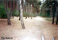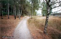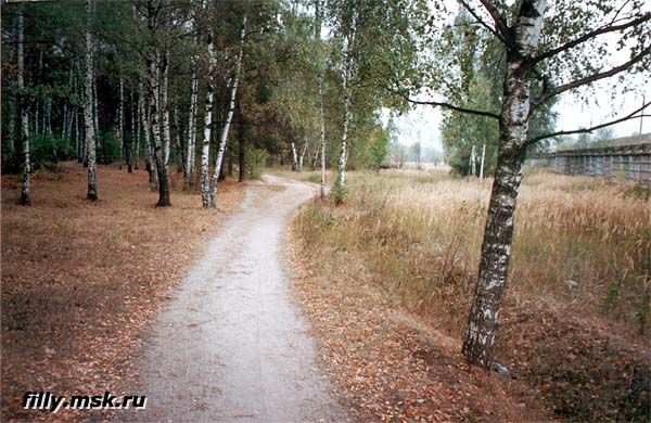 вход в парк, слева от пруда. Дорога идет вдоль Бугра (насыпи над линией